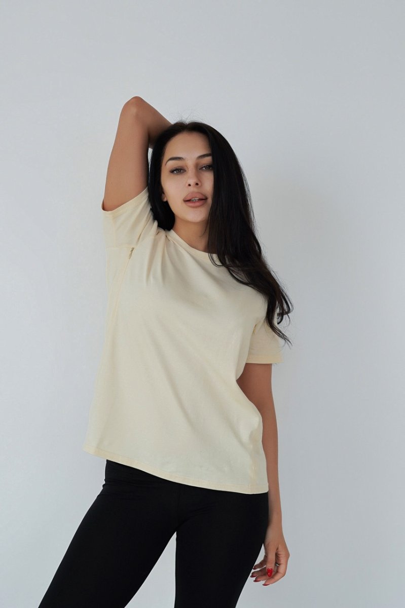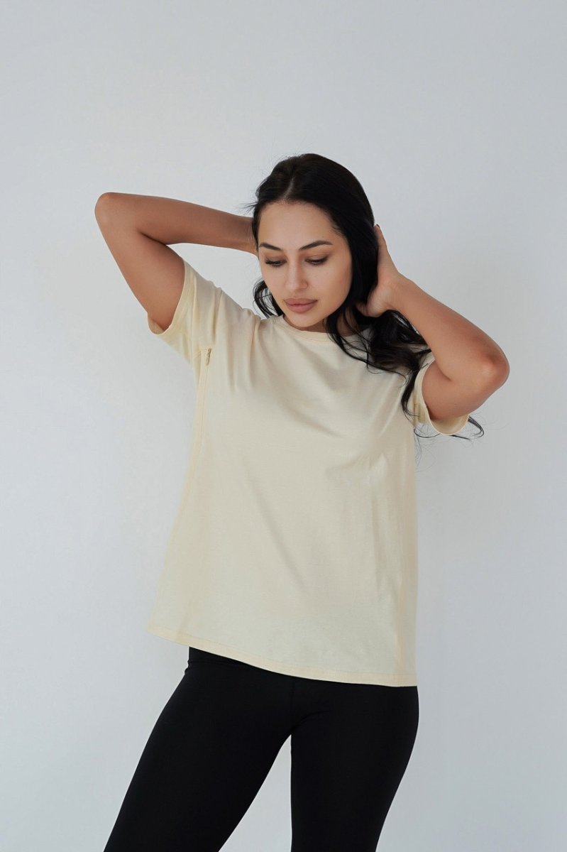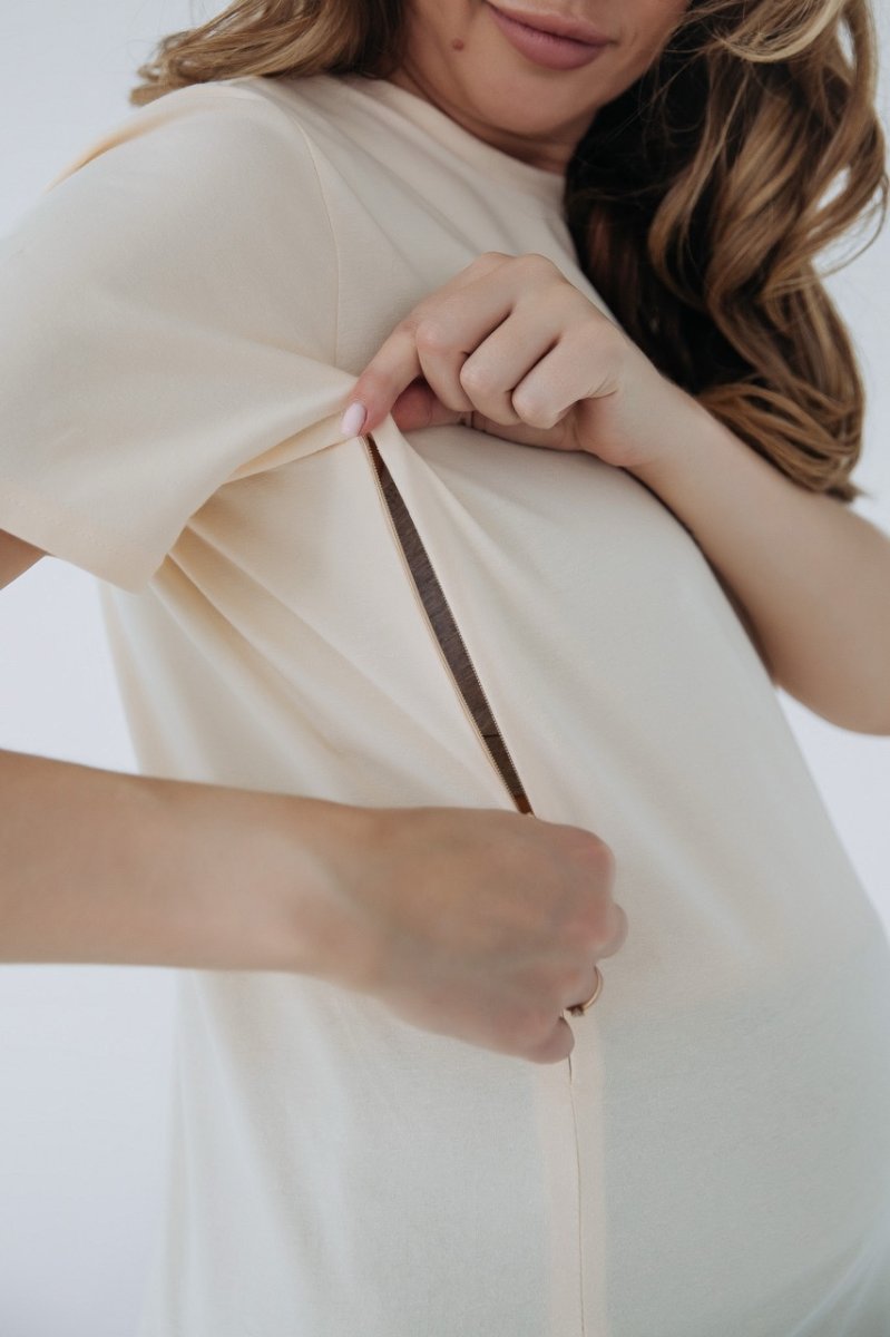 Універсальна бавовняна футболка для майбутніх мам і мам, які годують. Модель вільного крою з достатнім простором для росту живота, для швидкого та непомітного годування передбачено секрет у вигляді замаскованих змійок у нагрудних рельєфах. Відмінно сидить і після вагітності