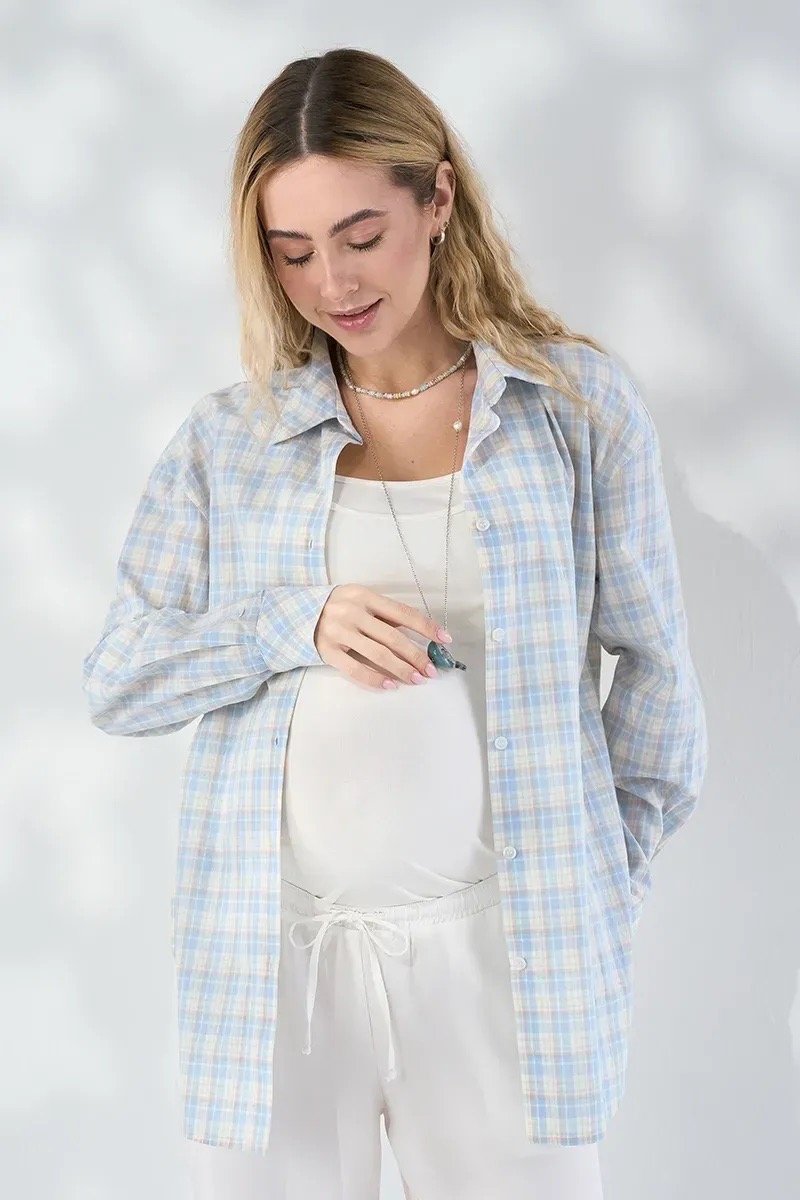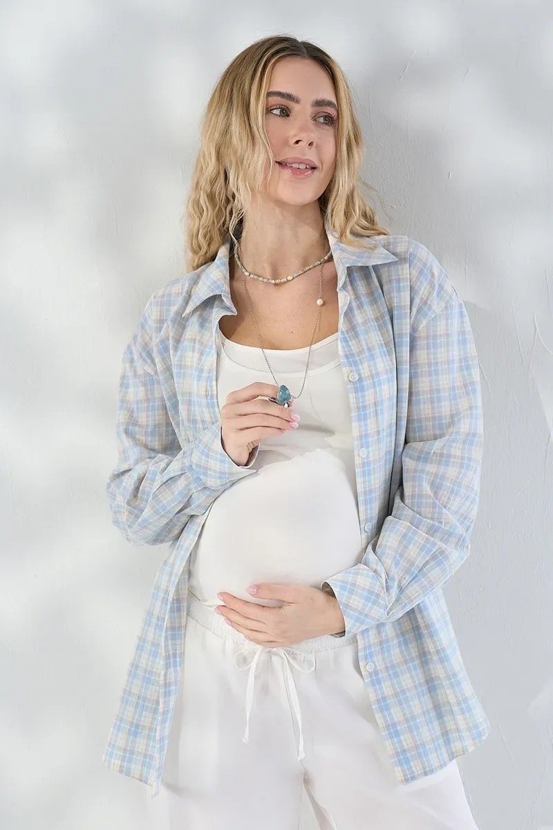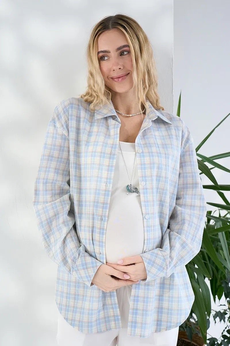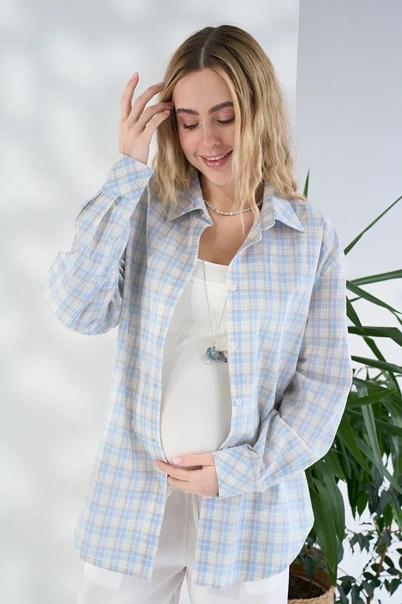 Картата сорочка з вареної бавовни для вагітних та годуючих — блакитно-молочна клітинка