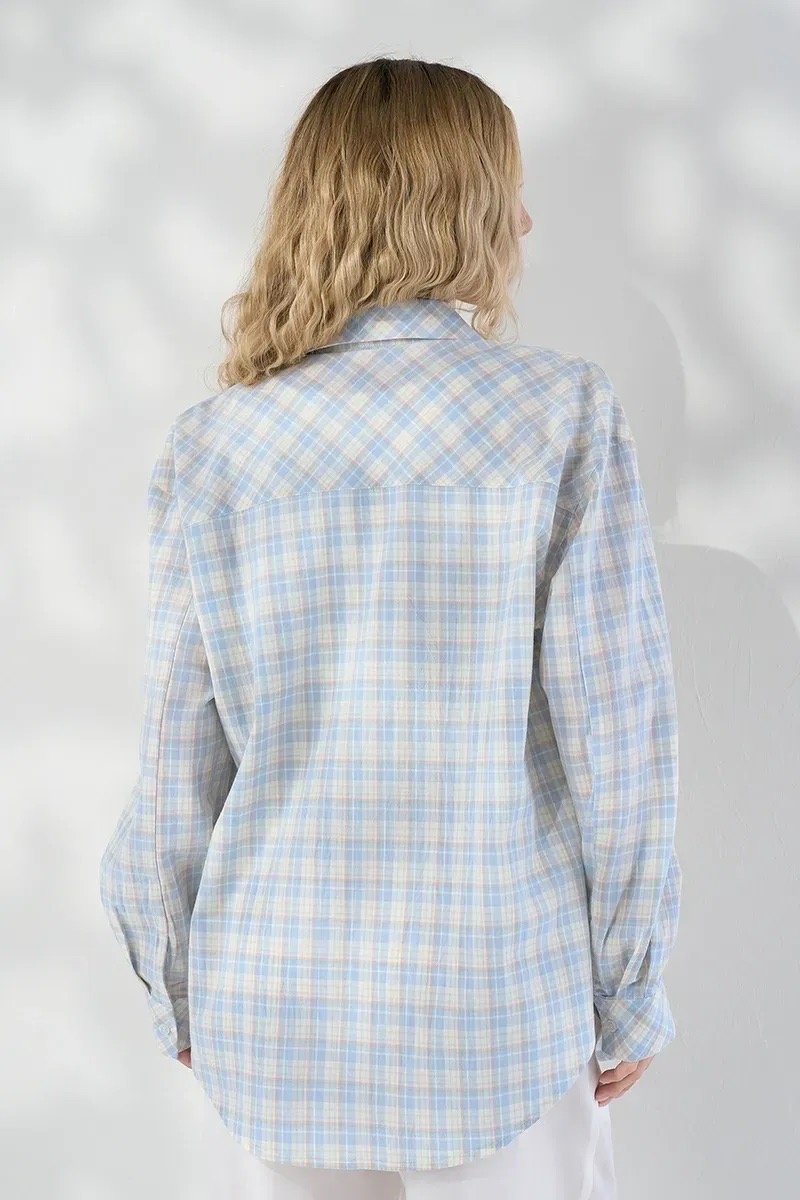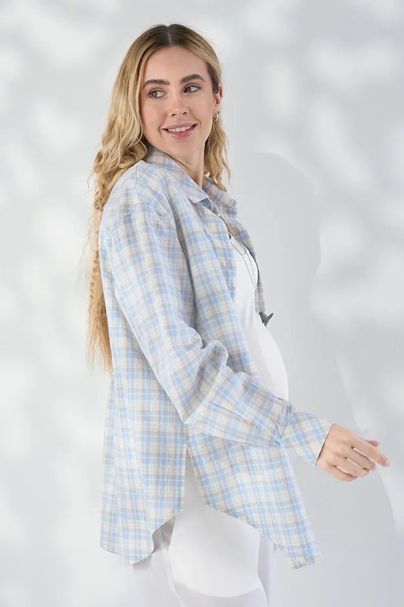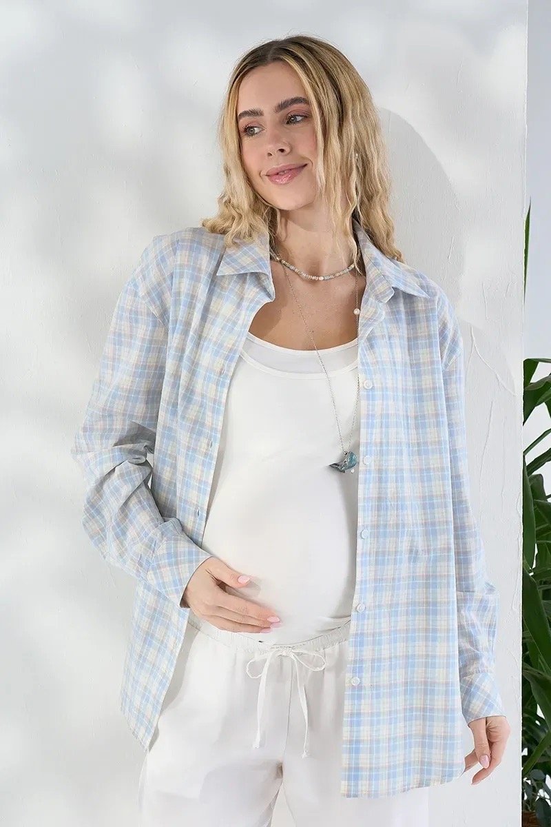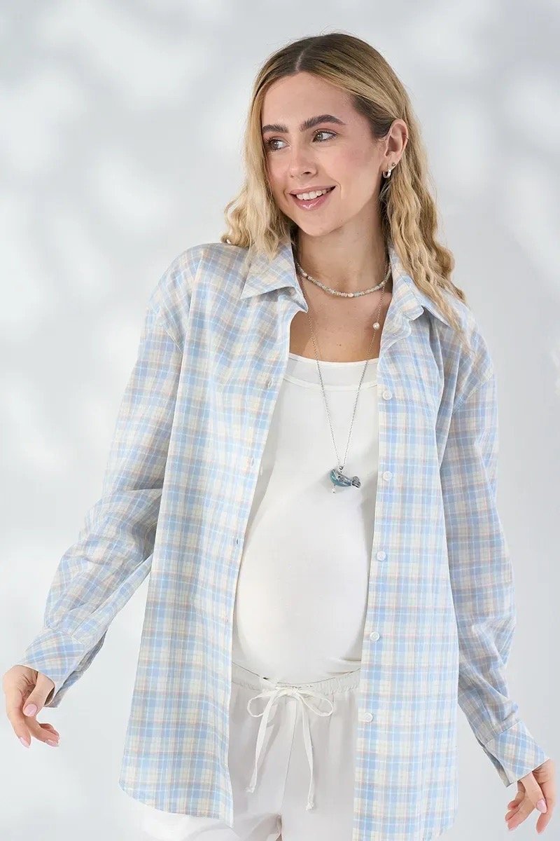 Картата сорочка з вареної бавовни для вагітних та годуючих — блакитно-молочна клітинка