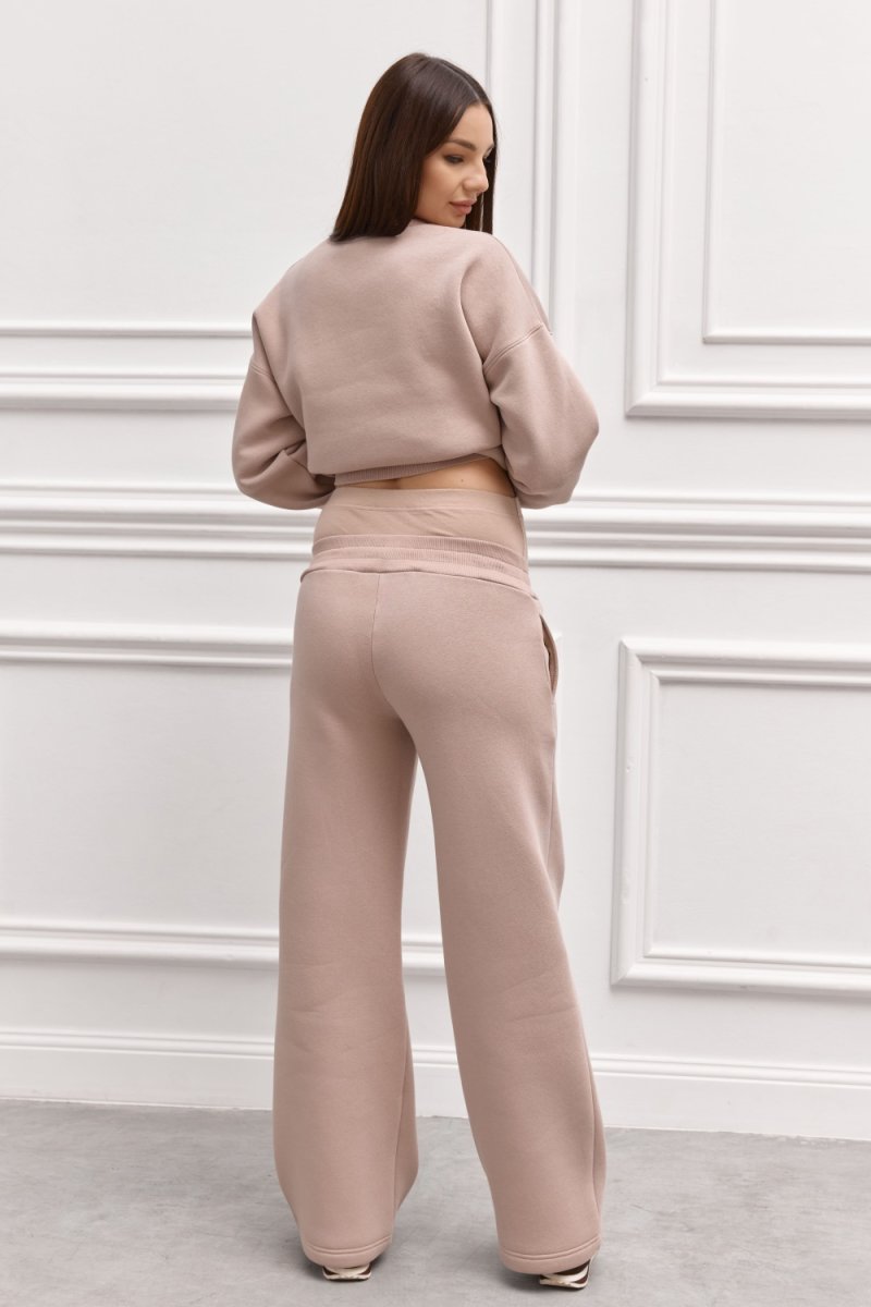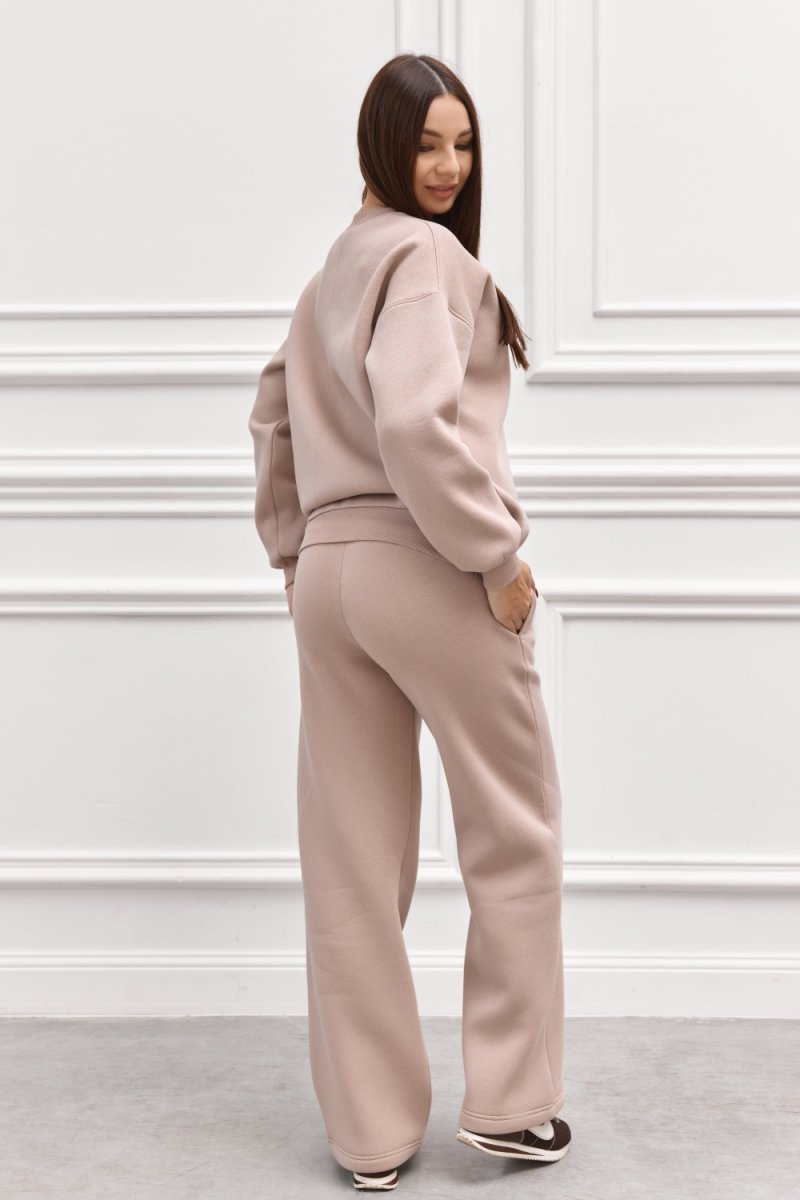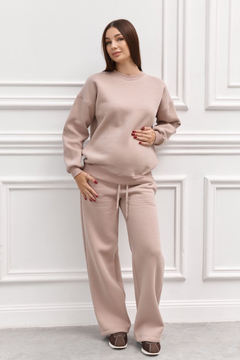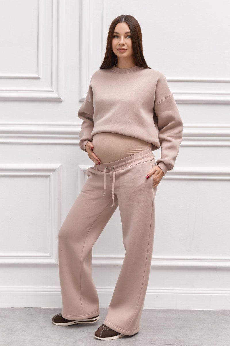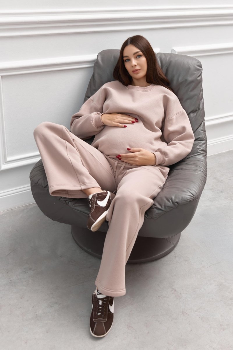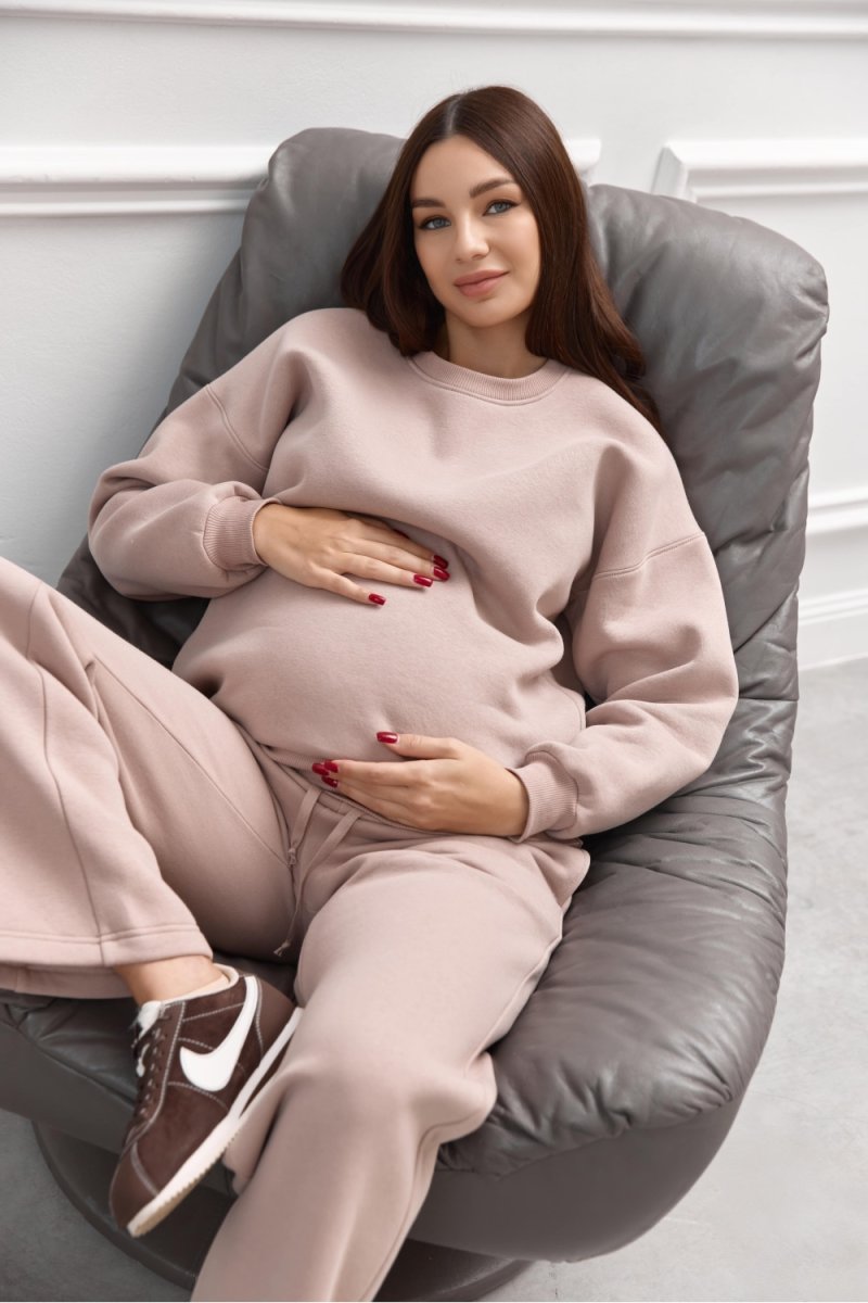 Спортивний костюм — це витончена гармонія зручності та стилю. М’який трикотаж із флісовим утепленням забезпечує тепло, а вільний крій адаптується до змін фігури під час вагітності. Пудровий колір додає ніжності образу, створюючи елегантний вигляд навіть у повсякденності. Ідеальний вибір для прогулянок, відпочинку чи домашнього затишку.