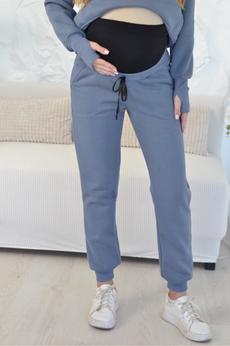 Брюки на манжетах, имеют хлопковую трикотажную вставку на живот и пояс из эластичного материала, что позволяет наиболее комфортно фиксировать животик. При необходимости трикотажную вставку можно убрать и носить как обычные штаны.